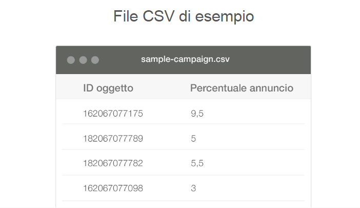 Se, scegliendo la seconda modalità, avrai selezionato un'intera tua categoria, questa ti verrà automaticamente esportata in un file in cui dovrai andare a inserire la percentuale da te offerta per ogni ID oggetto, invece, se scegli di caricare un csv, questo dovrà avere il seguente formato: