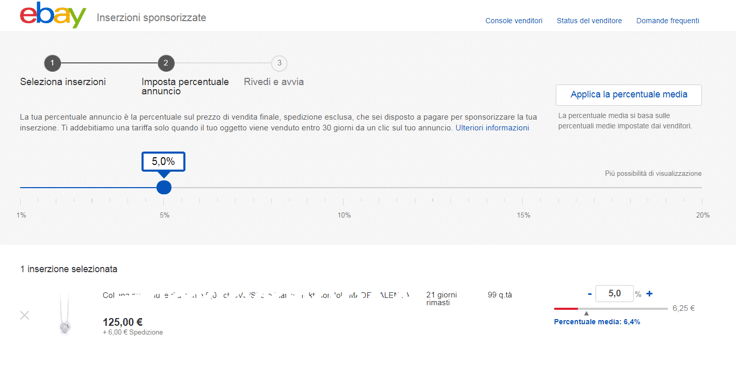 Se scegli la prima modalità, quella manuale, hai la possibilità di selezionare le inserzioni "consigliate" cioè di mettere in evidenza delle inserzioni che eBay stesso ti consiglia, sulla base delle tendenze rilevate sul marketplace. Diversamente puoi spuntare le singole inserzioni da te desiderate. Come piccolo suggerimento ti viene data la percentuale media impostata dagli altri venditori tuoi concorrenti.