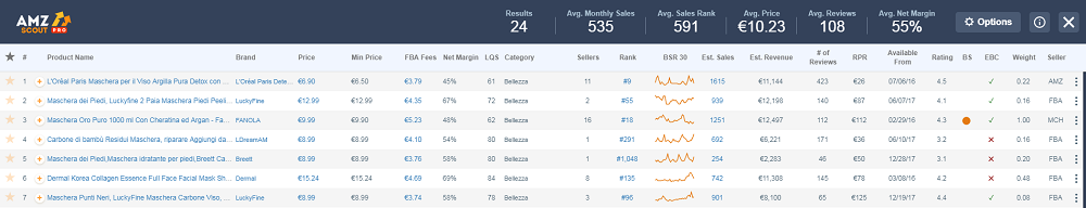 Nell’esempio qui sotto (ho cercato il prodotto "maschera" nella categoria Bellezza) possiamo rilevare i seguenti dati importanti che potrebbero condurci a trovare dei nuovi prodotti da vendere: